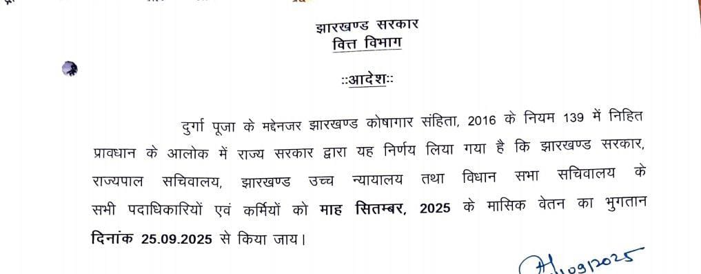 Jharkhand सरकार ने आदेश जारी किया: सितंबर 2025 का मासिक वेतन 25 सितंबर से दिया जाए